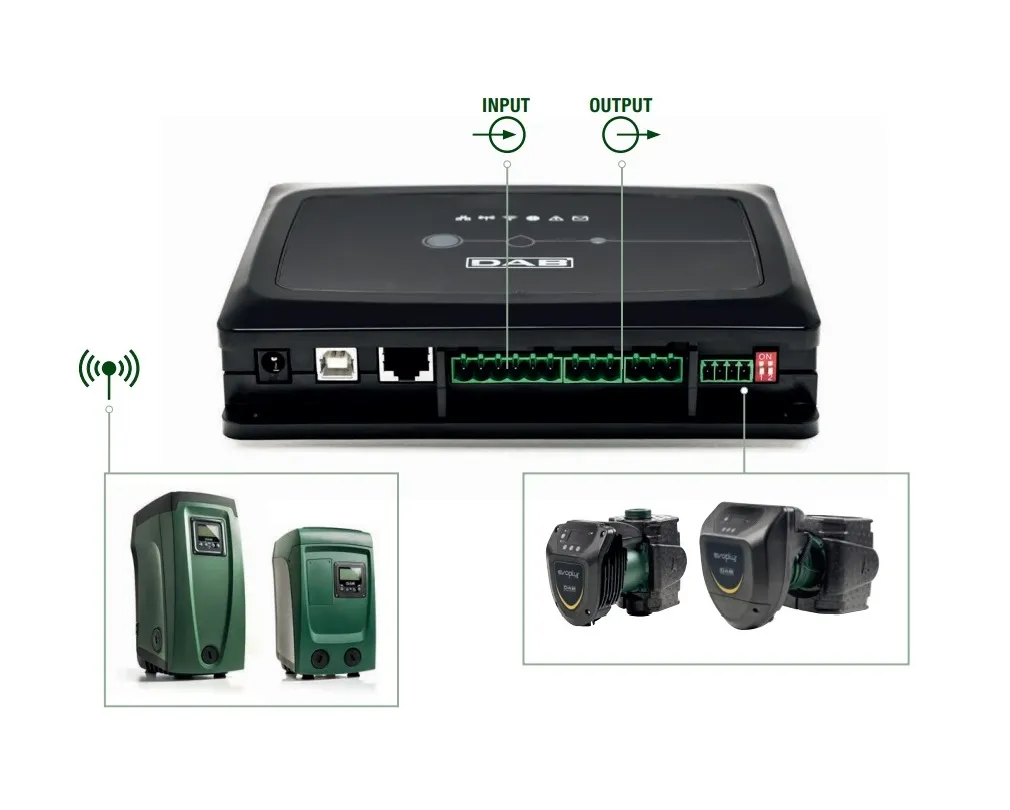 Bedien je pomp op afstand met de handige DAB D.Connect Box. De D.Connect Box sluit je eenvoudig via WiFi of een ethernetkabel aan op de modem in je woning. Hierna kun je eenvoudig via de app je pompen aan deze D.Connect Box verbinden. Denk hierbij aan drukverhogingspompen, circulatiepompen, Beregeningspompen, vuilwaterpompen en meer. De pompen communiceren hiervoor direct via Bluetooth of via een kabel met de D.Connect box. Via de D.Connect Box kun je meerdere pompen met de DAB cloud service verbinden.